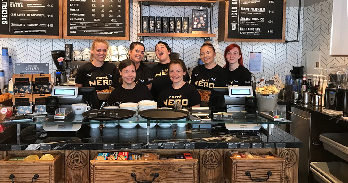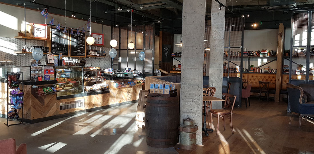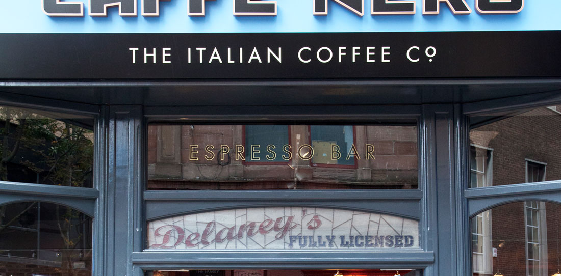Bedrock has been working with Caffè Nero in Northern Ireland since 2008, but with the expansion into the Republic of Ireland in 2013 we were asked to give the south it’s own unique take on the brand, with a greater emphasis on a local, more individual approach. We created the warmth and comfort of a cosy sitting room by introducing a mix of bespoke hand-carved back bars, eclectic reclaimed furniture, real fires and locally sourced pieces to make each coffee house unique. Traditional sign-writers are frequently used for storefront signage, and chalk artists create artwork for all ‘A’ boards, back of bar menus and coffee authority messages. The first ROI store opened in Merrion Row, Dublin in March 2014 – on St Patrick’s day, of course