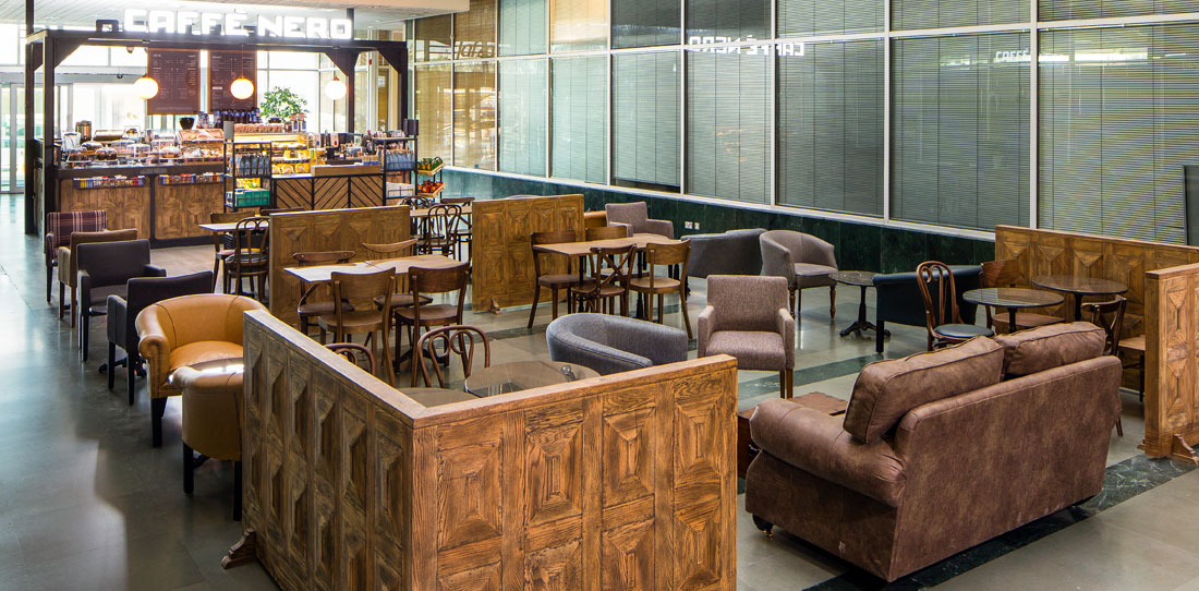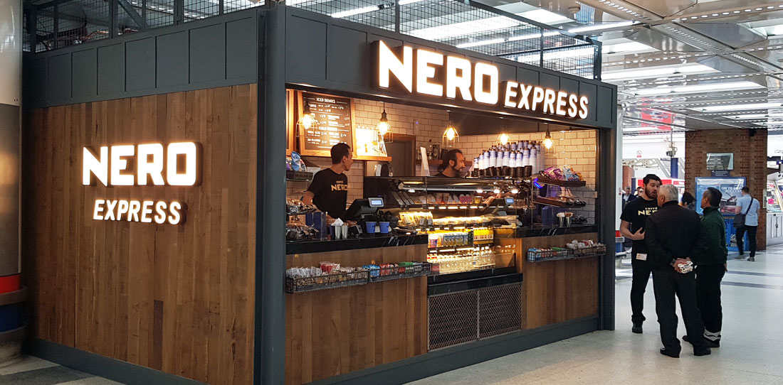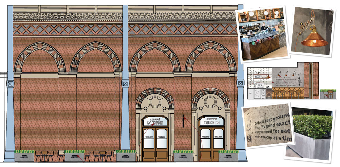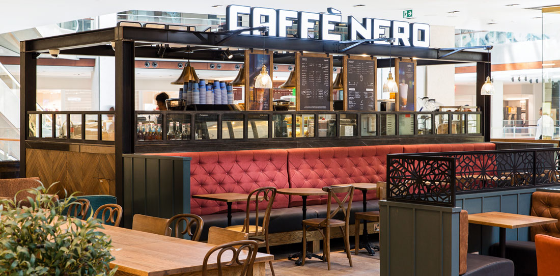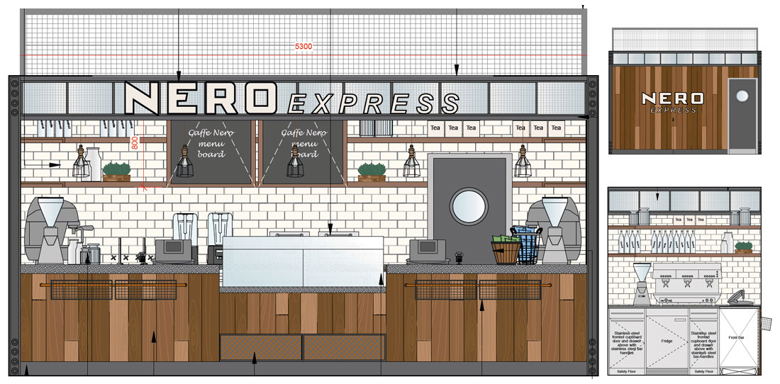 When space is a premium, Caffè Nero operates out of kiosks and express stores. The design priority is maximising the customer flow to increase revenue. Kiosks are stand-alone units used in stations and airports, while express stores are small takeaway units with minimal seating, designed for use in high streets, stations, and shopping centres. Bedrock has designed a range of kiosks themed around metal, glass, and timber to sit comfortably within different environments. Our most recent brief has been to design a reusable sustainable kiosk that can be easily transported and assembled.