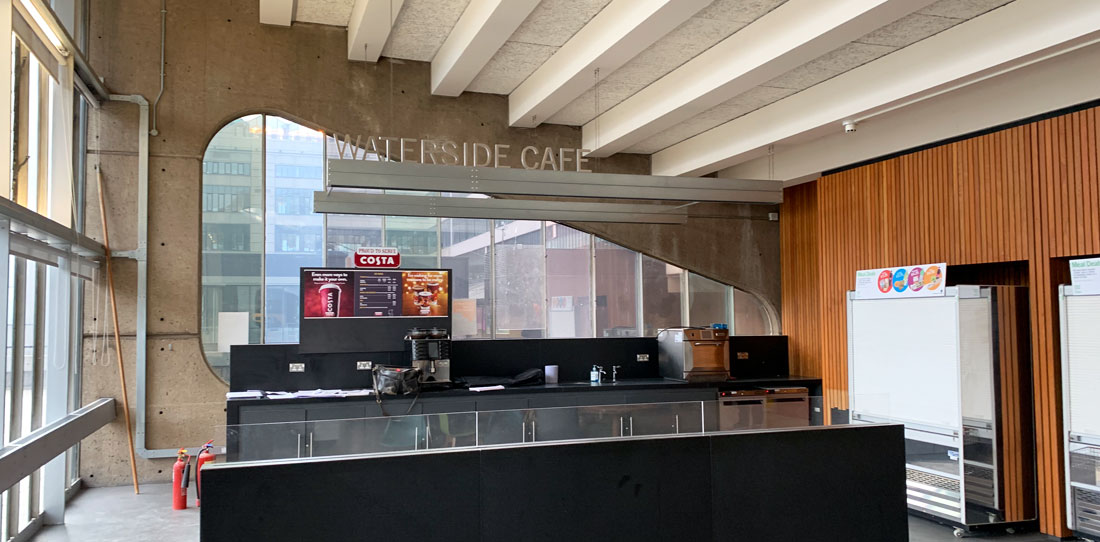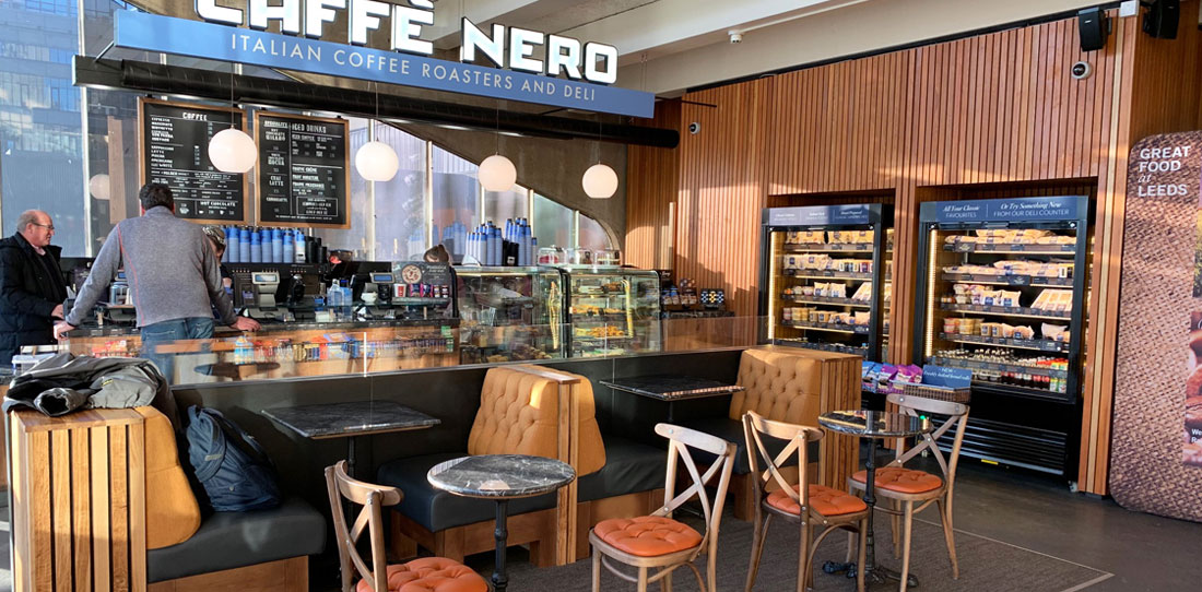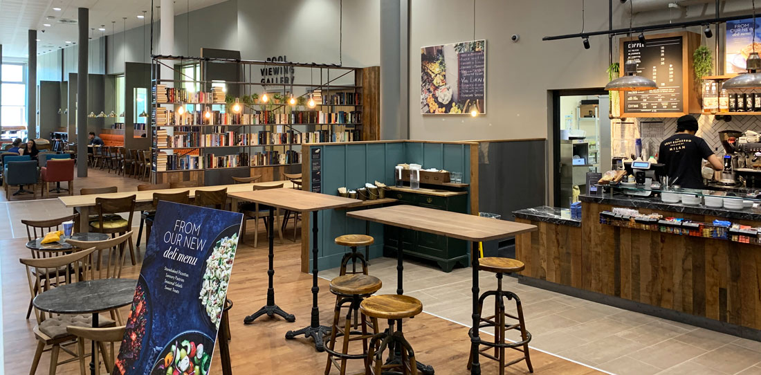 Our first Caffè Nero project on a university campus was in the brand new Laidlaw Library at the University of Leeds, and its success led to two other key campus locations, both of which are Grade II listed. Our designs focused on free-standing structures that didn’t disturb the internal fabric of each building. The architects of the 1970s Roger Steven’s building are better known for designing the Barbican and had used concrete coffered ceilings again here. By contrast, the café for the Business School was sited in a former church redeveloped with a modern glass extension. We have also designed the Caffè Nero within the University of Warwick’s Sports Hub and concession sites within Blackwell’s university-based bookshops at Manchester and Liverpool.
