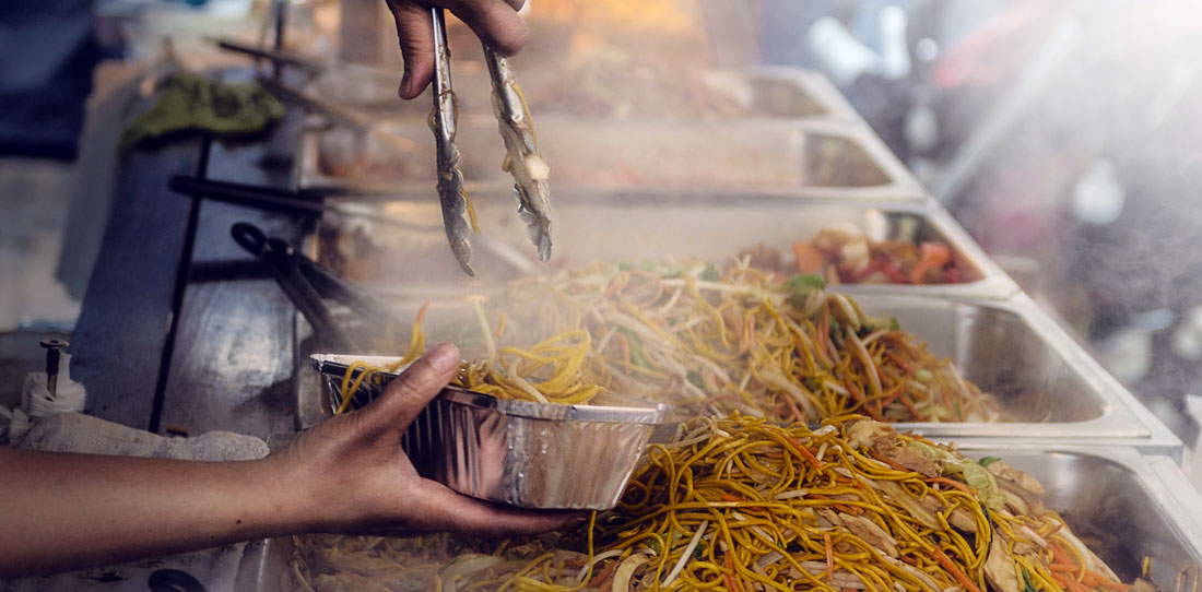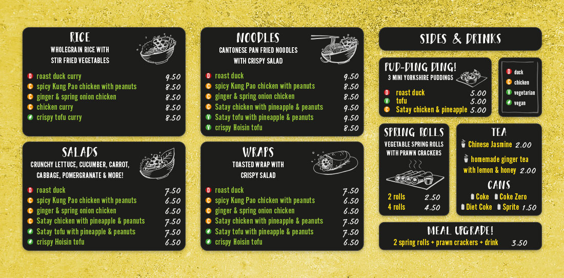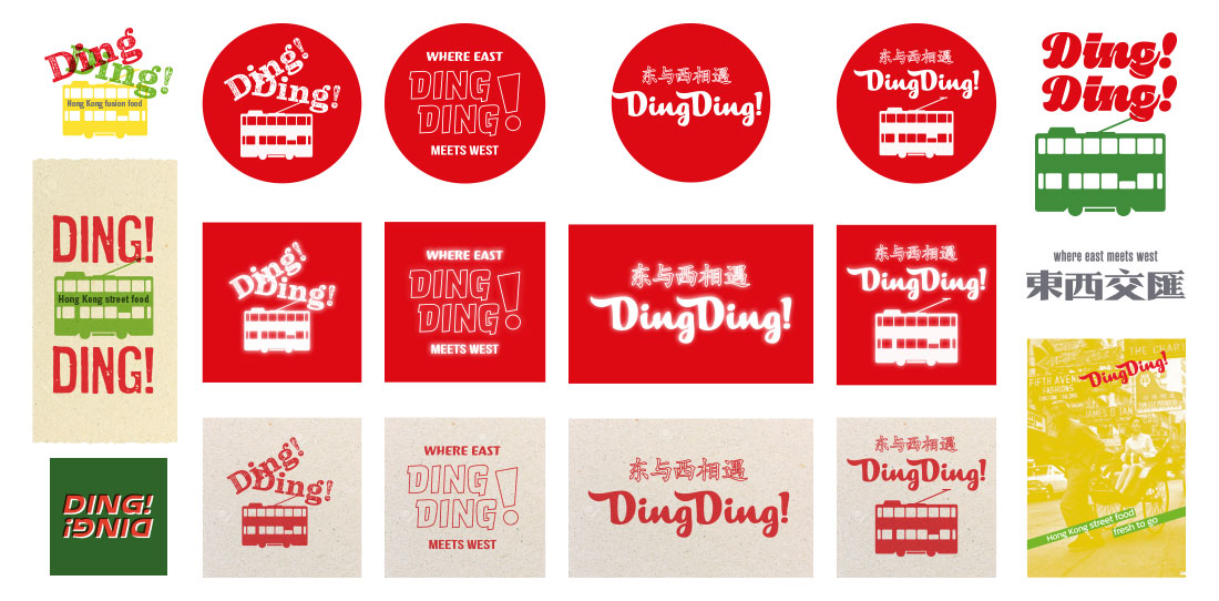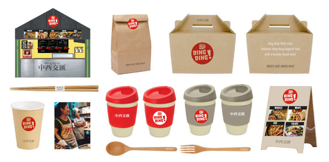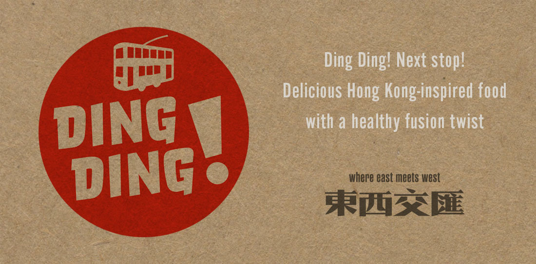 Ding Ding! is a popular street food kiosk in Tooting Market, south London, offering delicious Hong Kong-inspired food with a healthy fusion twist. Our client, William, was born in Hong Kong, and after many years working in the food industry he decided to follow his dream and explore ideas for a fast food business. His breakthrough dish was the Roast Duck Salad Wrap and called his new company ‘Ding Ding!’ in honour of Hong Kong’s iconic trams. With a view to rolling out the brand across more sites, William asked us to help with the food branding; redesign the logo; rewrite the descriptor; create lo-tech signage, a flexible menu system and a range of eco-friendly brand applications.