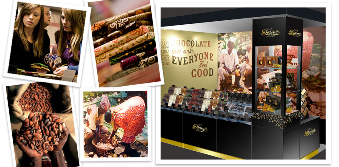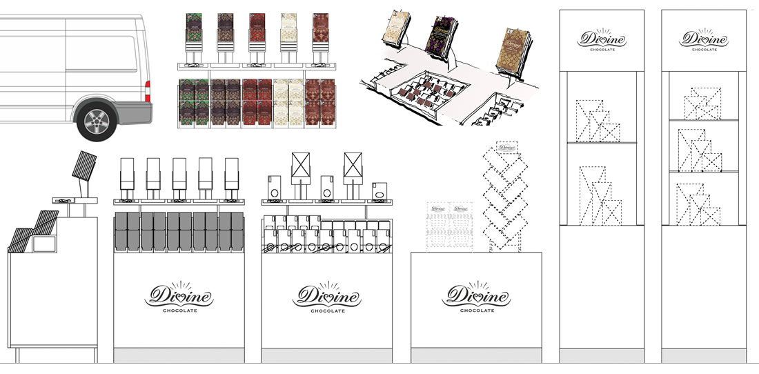 Divine Chocolate pioneered the first farmer-owned Fairtrade chocolate company to hit the UK market. Their brief to Bedrock was for a simple, effective, and reusable exhibition display system to help them communicate their brand with the passion demanded by their ethos. Practical challenges such as adaptability to different venues were overcome by creating a basic kit of parts that could be modified to work within a range of exhibition spaces. Importantly, the whole kit could be packed into any standard transit van, and the exhibition system has been used at numerous food and leisure events throughout the UK.