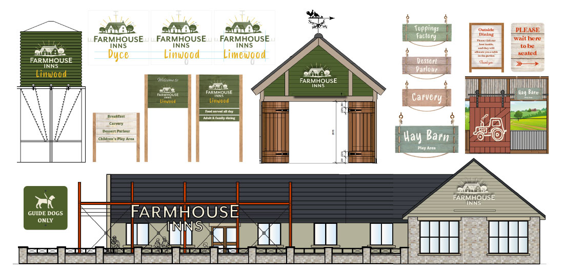 Working in partnership with brand specialists Mavis, part of the Maverick Group, we created a new brand and interior concept for Greene King’s popular Farmhouse Inns carvery. Visually we needed to reinforce the brand’s values of warmth and honesty through farmhouse vernacular and natural materials. The first site in Linwood, Renfrewshire, is now open, offering its signature cakes, ice creams and fresh carvery alongside exciting new play areas. As well as the interiors, Bedrock was responsible for developing the logo across internal and external signage schemes, wall graphics, bespoke wallpapers and tiles, as well as picture sourcing.