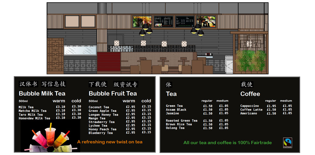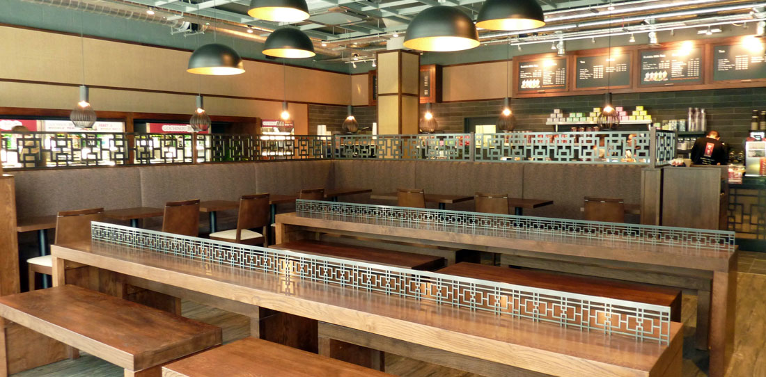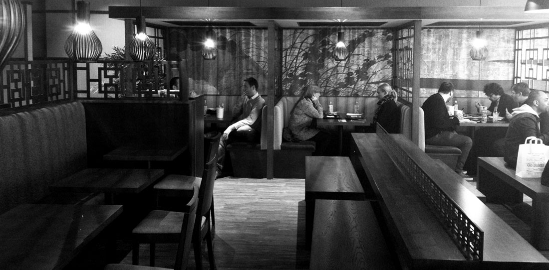 Following the success of our work for Chisou’s Japanese restaurant in Mayfair, our client asked us to design the first store for their new fast food concept called GoChisou, located in Chiswick Business Park. Sushi, bento, noodles and salads are freshly prepared on the premises every day for the office lunchtime crowd – eat in, take-away or delivery. We used warm woods to unify a mix of seating; poser stools in the window, long communal tables with benches and quieter booths with charging points for groups and informal work meetings. A Japanese wallpaper mural links the booths and sets off the colour palette of cool greys and greens against bespoke metal fretwork screening.