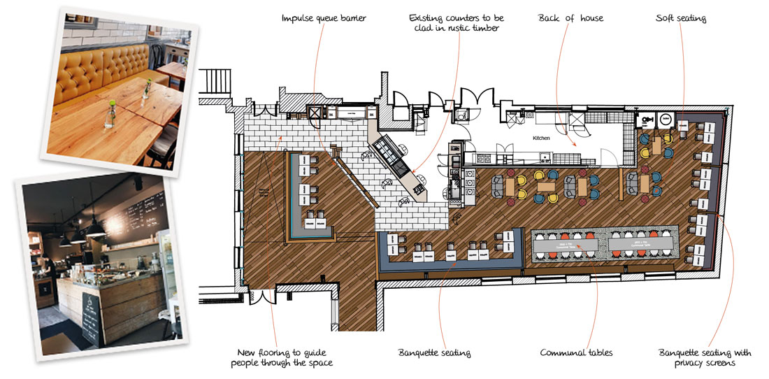 Following a recommendation, ReAssure asked us to create a larger staff canteen in their Hitchin offices. They were planning to increase staff numbers but only had a small café area, so additional space had been allocated connected by a short corridor. Our brief was to create a range of exciting food offers throughout the day to encourage the staff to stay on site. We proposed a café deli in the original space and a variety of food stations within the new space to avoid single-file queuing. The scheme also included a mix of hard and soft seating to allow for informal meetings during quiet periods.