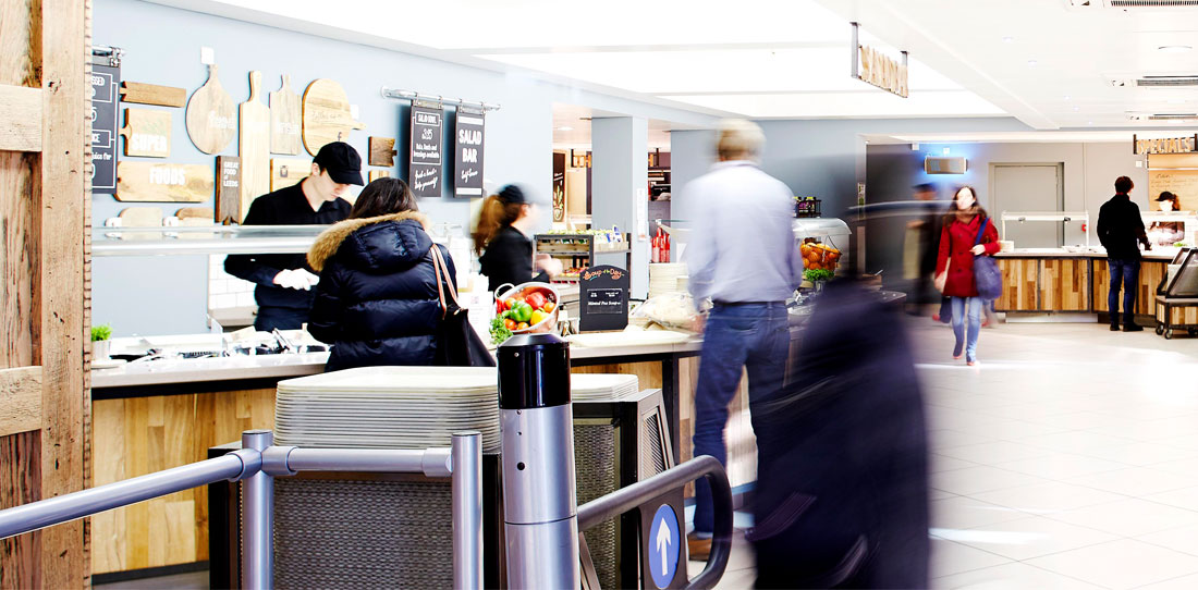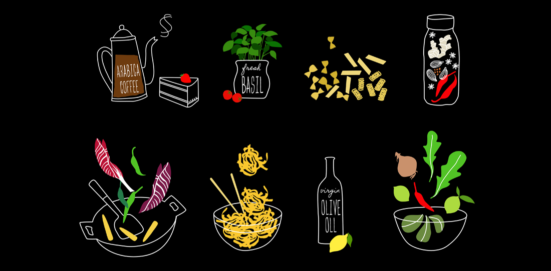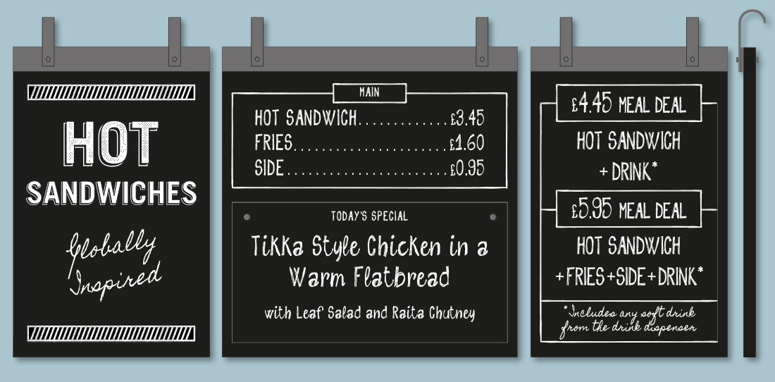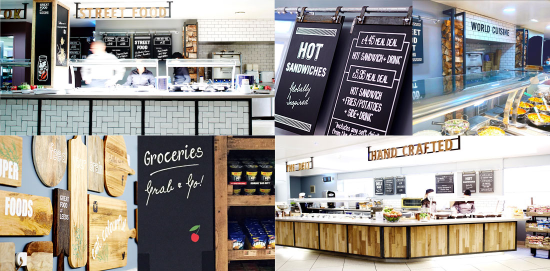 Impressed with our work for Caffè Nero in the Laidlaw Library, the catering team at the University of Leeds asked Bedrock to refresh the servery of the main refectory to support the launch of a brand new food offer. We created a new colour scheme, overhead signage, menu boards and wall graphics, all within a limited budget. A chalk-style menu system allowed for over 60 specials within a 20-day menu rota, and illustrations were commissioned to reflect the freshness and theatre of the on-the-spot preparation.