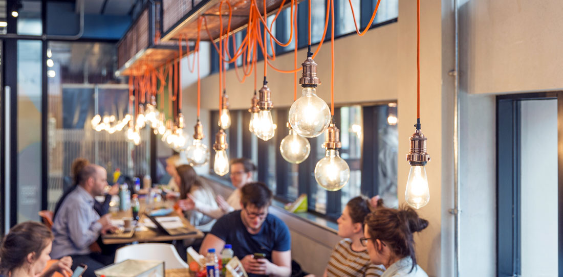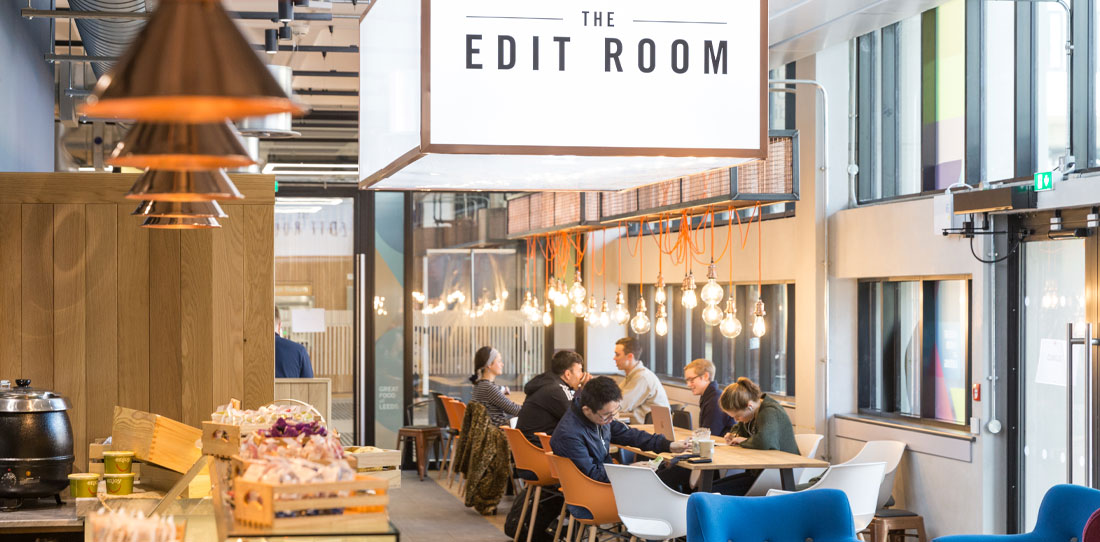 The refurbishment of Grade II listed Edward Boyle Library at the University of Leeds required a new café concept to front the main entrance. The offer consisted of craft coffee, pizza, and a mix of grab-and-go food and drinks from local suppliers. The university supplied the logo from which we created a contemporary interior of light oak, concrete, blackened steel and copper finishes. An eye-catching 2.4m long lightbox floats above a mix of communal and private seating zones. We also designed the signage, window decals, menu boards, wall graphics, brand messaging and, in honour of the location, Scrabble-style letters for the toilet signage | Service- Commercial interior design.