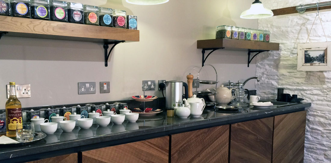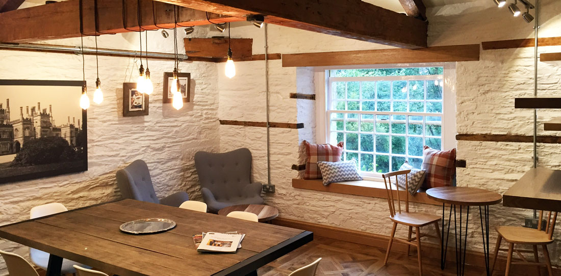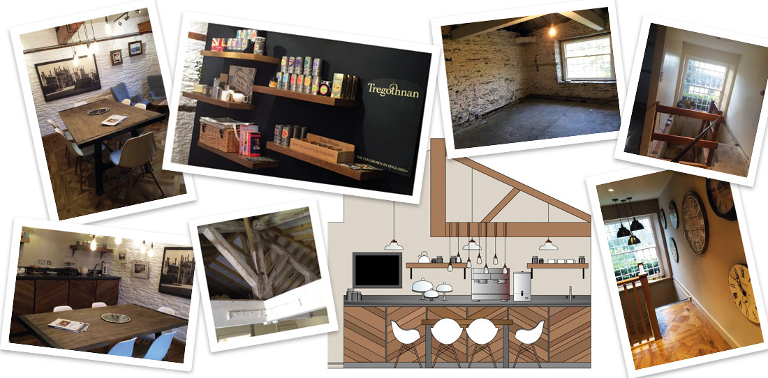 The Tregothnan Estate in Cornwall has been home to the Boscawen family since 1335 and is internationally known as the home of English tea. When Managing Director, Jonathon Jones, required an informal meeting room to showcase the estate’s teas he contacted Bedrock, having previously met John at a tea workshop. The site, a disused turkey loft, revealed original Cornish brick and oak beams, which we complemented with reclaimed French oak parquet floor tiles. Central to the room is a large reclaimed wood kitchen table and TV screen with a galley kitchen to the side. Half a dozen large clocks and the over-size teapot by the retail display wall playfully hint at the Mad Hatter’s tea party.