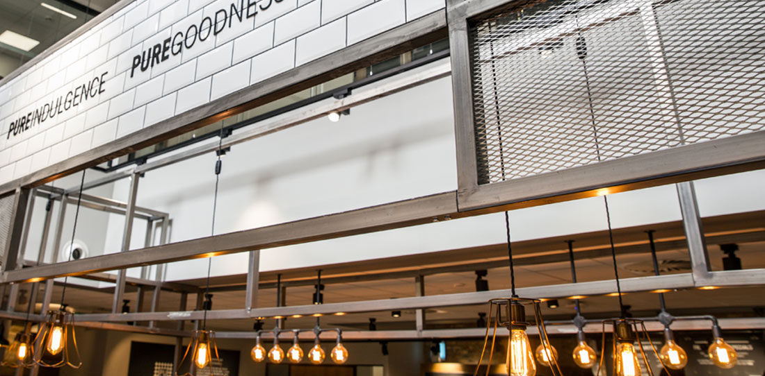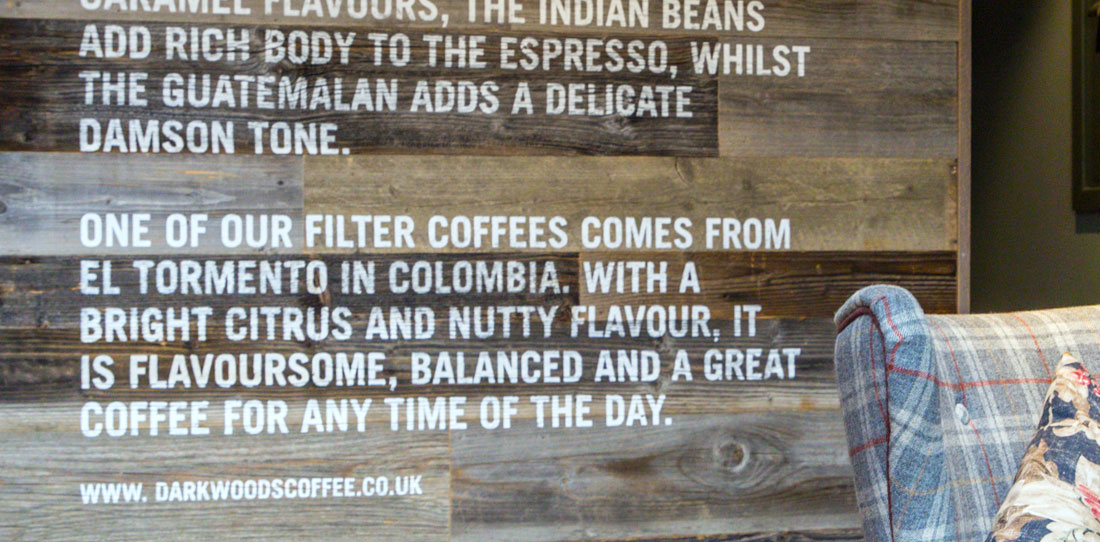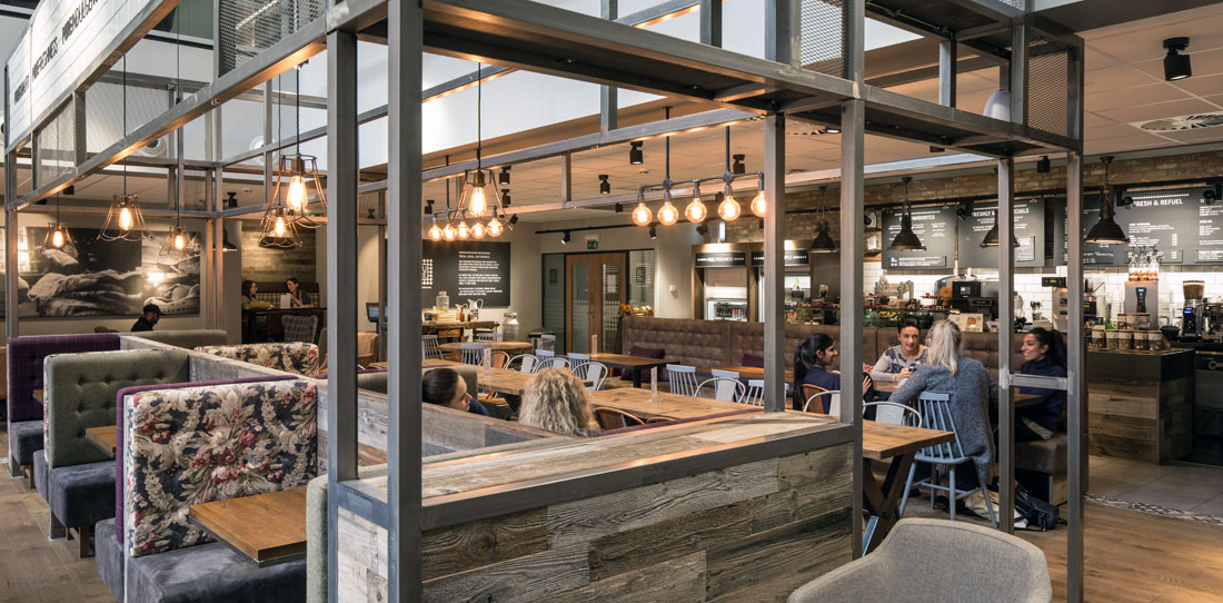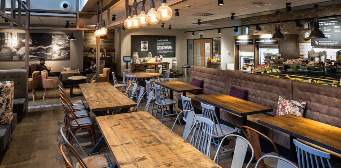Pure Café is located in the recently refurbished Worsley Building, home to the School of Medicine at the University of Leeds. Super-food smoothies and craft coffees from Yorkshire-based Darkwoods Coffee accompany a freshly prepared and locally sourced food menu. With a higher staff-to-student ratio the brief required a more premium feel for the food offer and a more comfortable interior. Different pockets of seating were needed for groups and more private meetings, so we designed a ‘goal-post’ structure within the double-height space to create ‘rooms within a room’. We also provided the signage, menus, and brand messaging, and photographed the Darkwoods roastery for the wall canvases.
