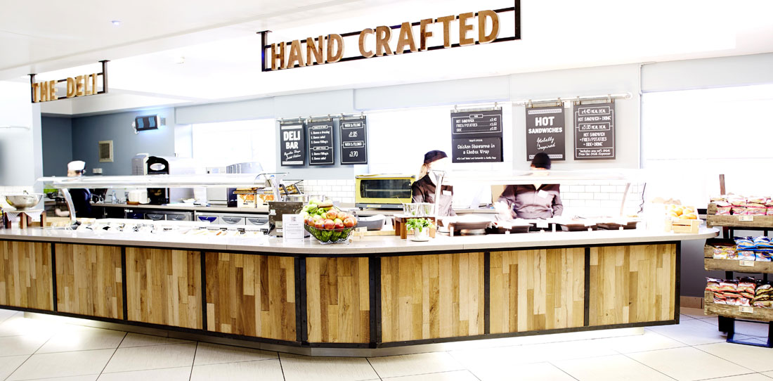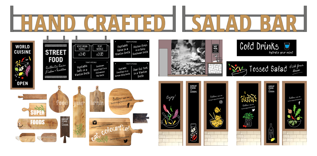 Impressed with our work for Caffè Nero in the Laidlaw Library, the catering team at the University of Leeds asked Bedrock to refresh the servery of the main refectory to support the launch of a brand new food offer in the Autumn term. In the first month of trading, The Refectory handled an additional 20,000 transactions. We created a new colour scheme, overhead signage, menu boards and wall graphics – all within a limited budget. The existing counters, fridges and till points were clad with a mix of rift-sawn oak and metro tiles set within an industrial metal framework. A chalk-style menu system allowed for over 60 specials within a 20-day menu rota and illustrations were commissioned to reflect the freshness and theatre of the on-the-spot preparation.